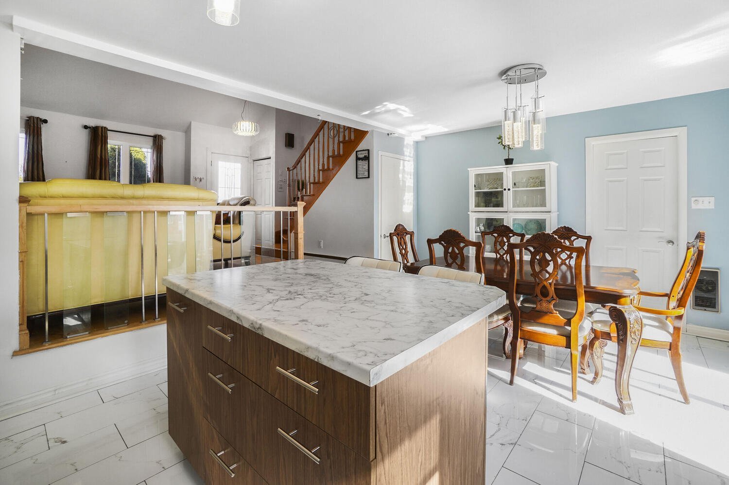 floors, a central island with a lunch counter for two, and