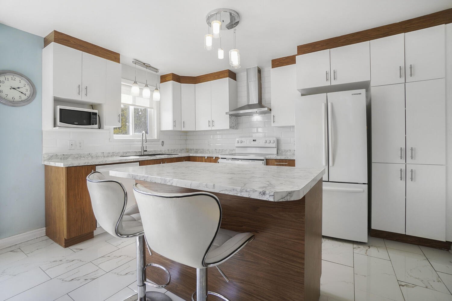 modern two-tone cabinetry. The patio door leads directly to