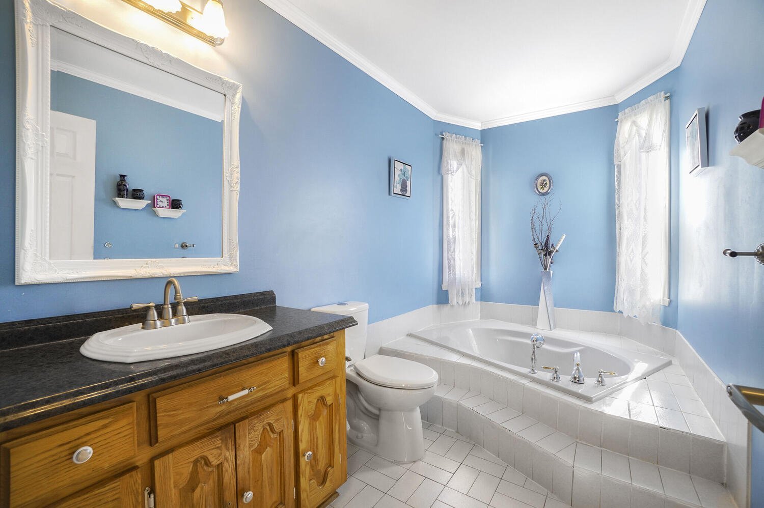 bathroom, with a podium bath, elegantly completes this