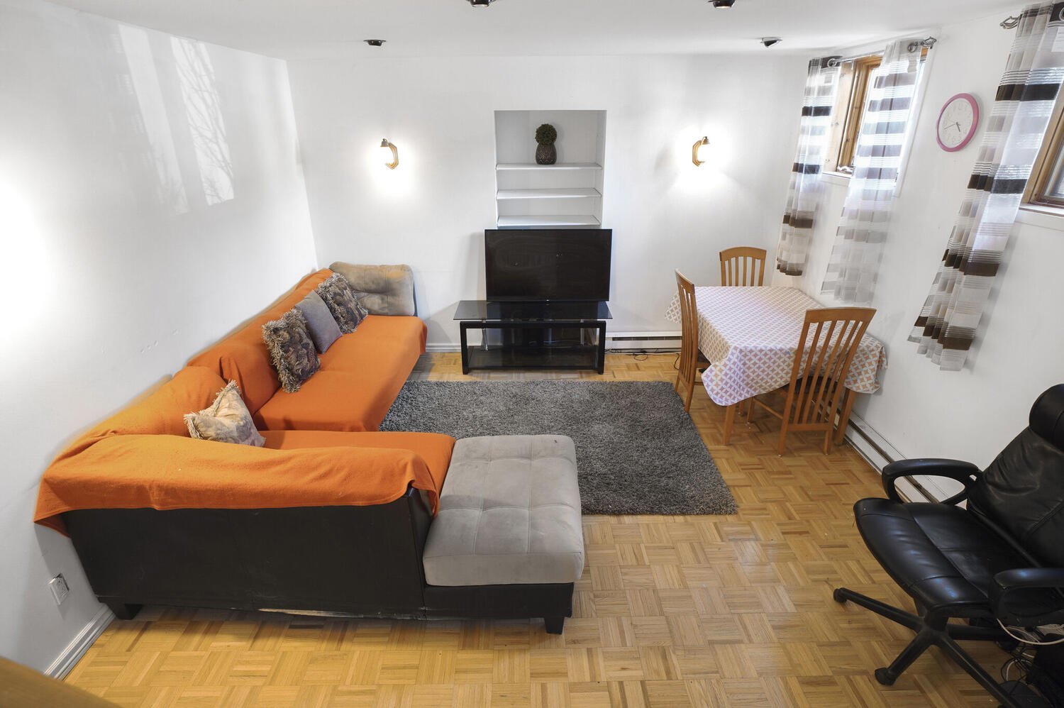 The basement offers a large family room with parquet