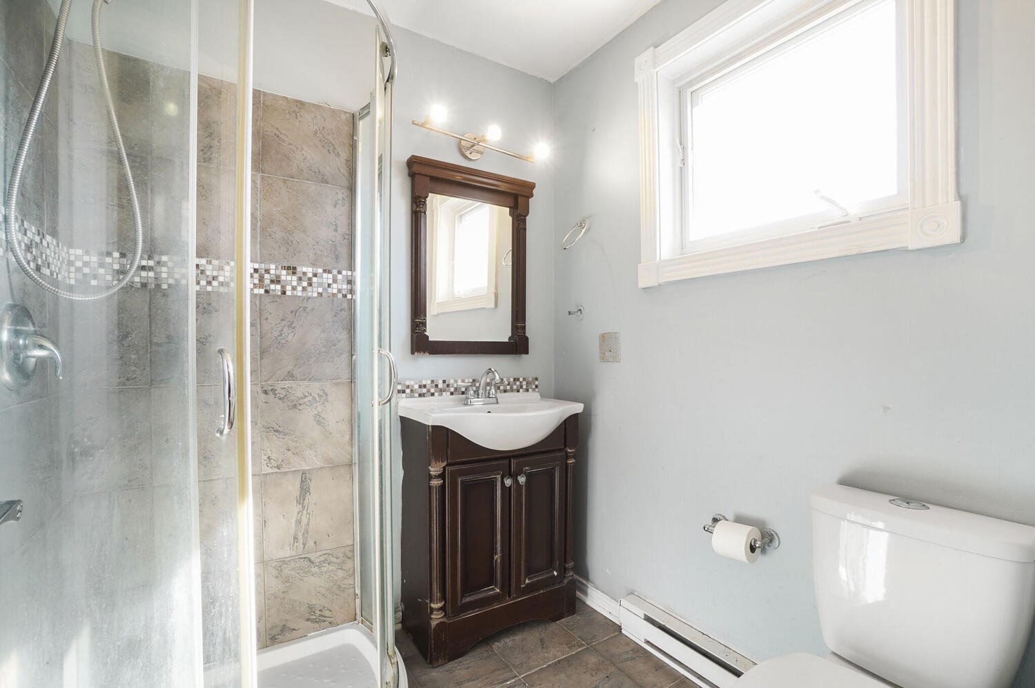 The main floor bathroom features a glass shower, and an