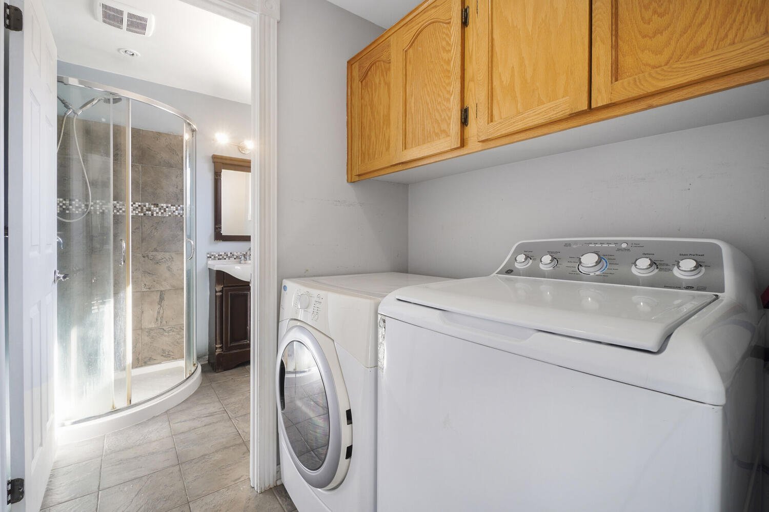 adjacent laundry room adds a practical touch to the home.