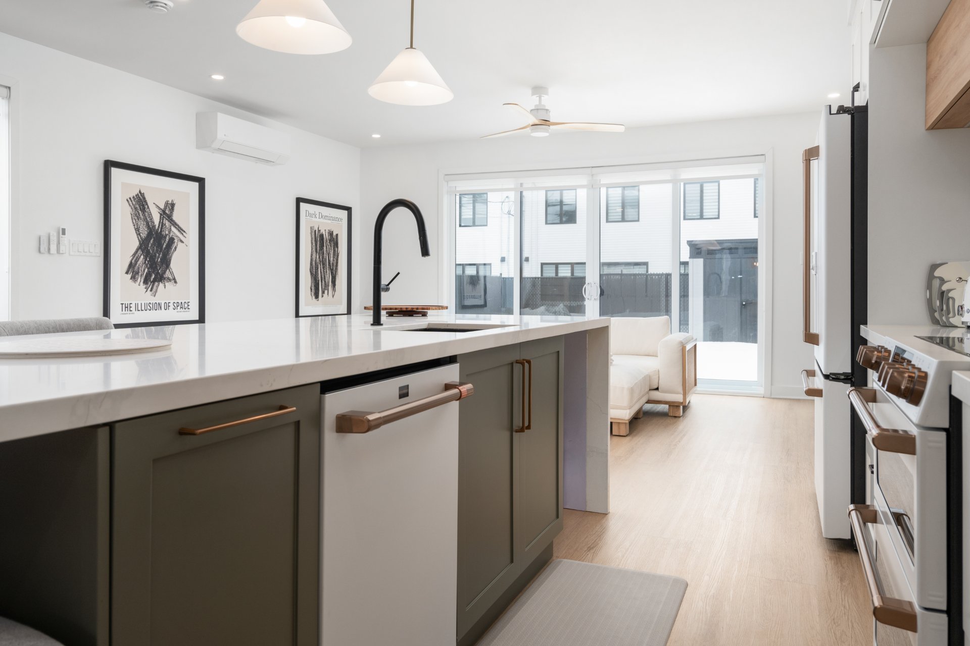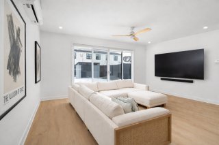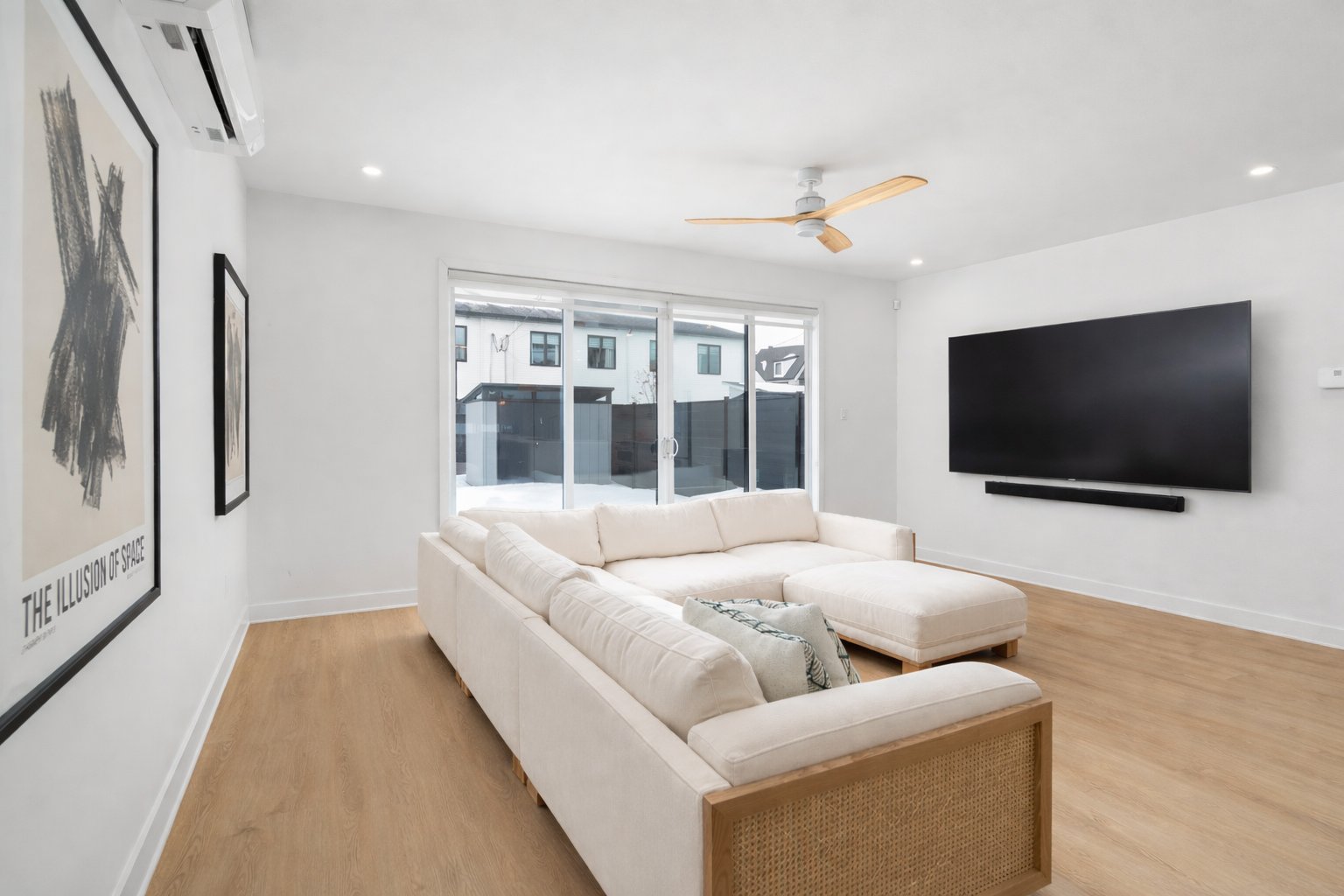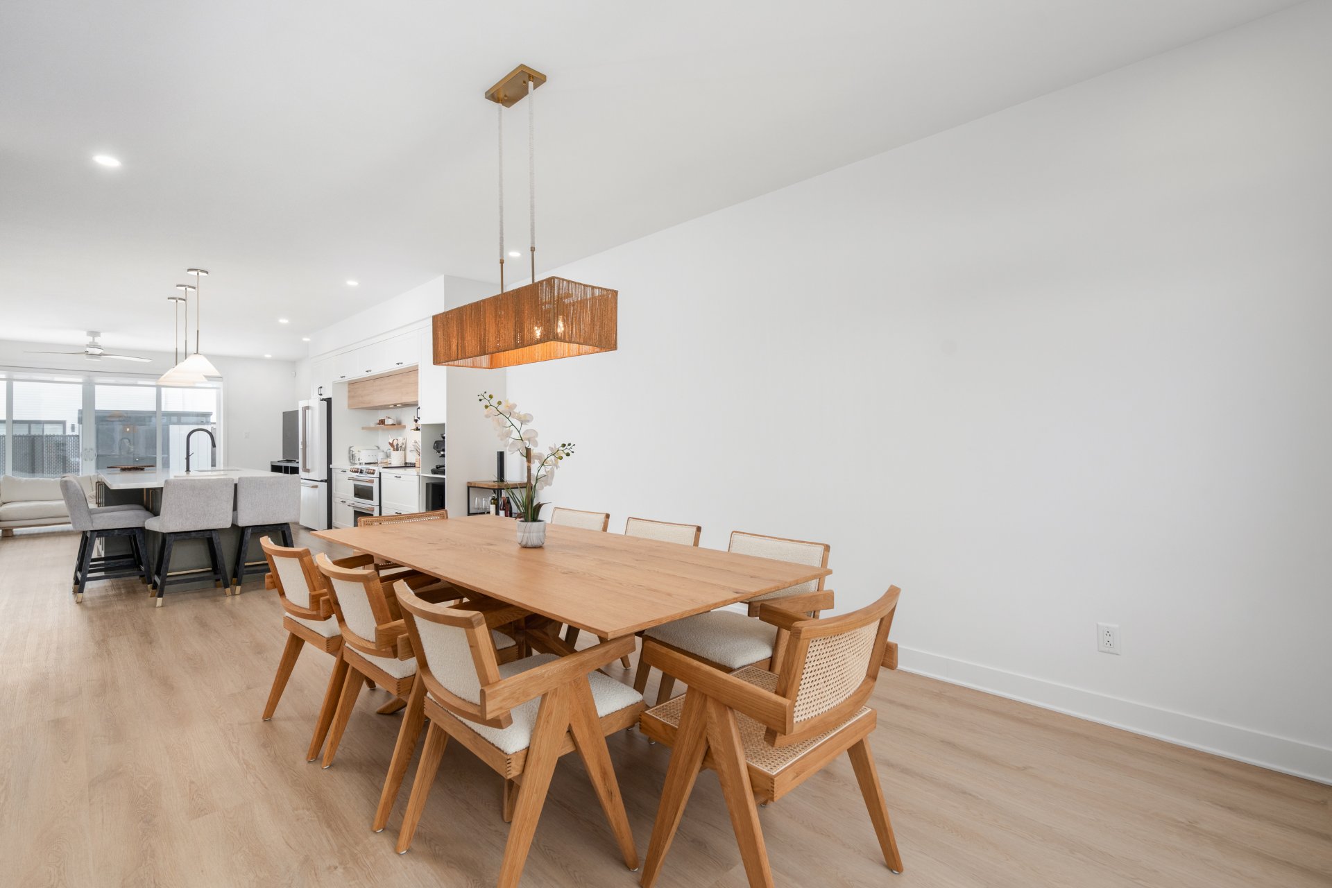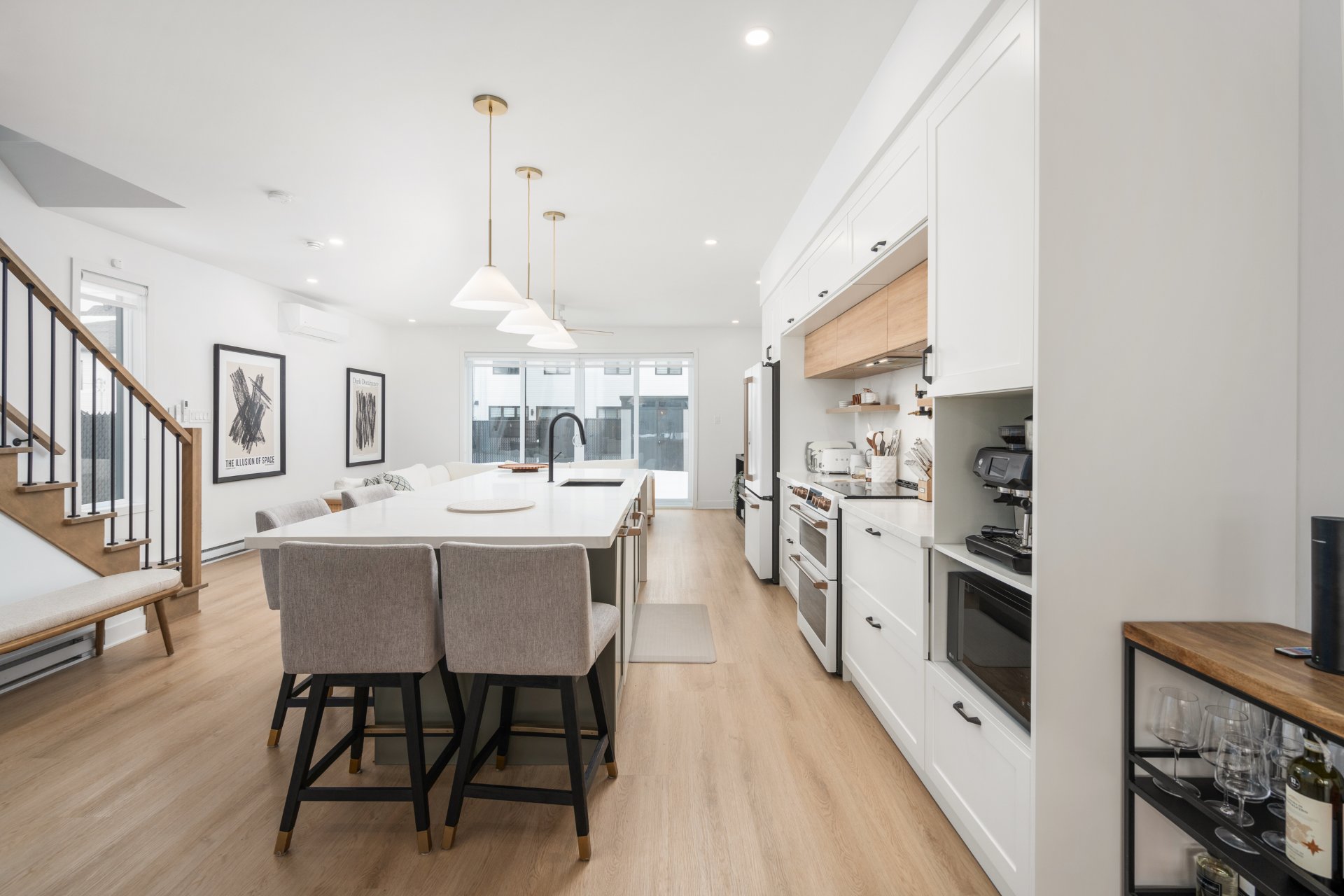 De grandes portes patio prolongent l'espace de vie vers l'extérieur, permettant à la lumière naturelle d'entrer abondamment tout en créant une belle continuité entre l'intérieur et la cour arrière.