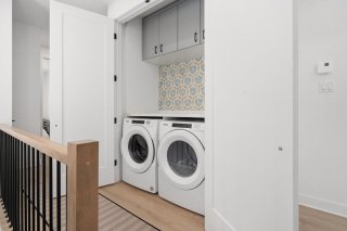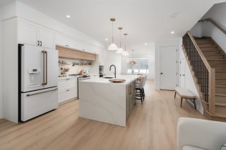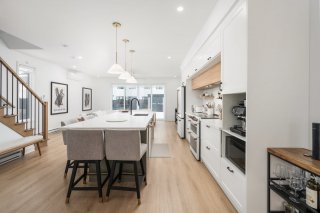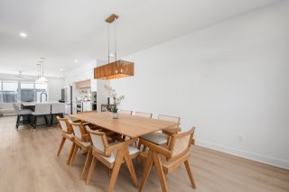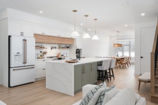Le rez-de-chaussée présente un espace de vie à aire ouverte regroupant le salon, la salle à manger et la cuisine dans une disposition harmonieuse idéale pour la vie quotidienne et pour recevoir. La cuisine constitue le point central de la maison avec ses armoires améliorées, ses comptoirs haut de gamme, son robinet pot filler, son éclairage rehaussé et son grand îlot, alliant style et fonctionnalité.